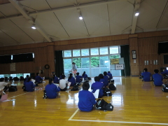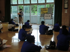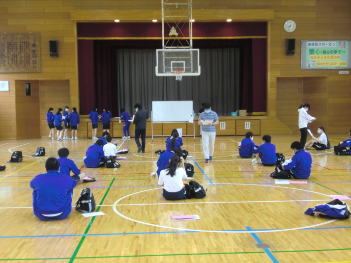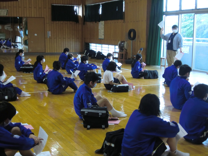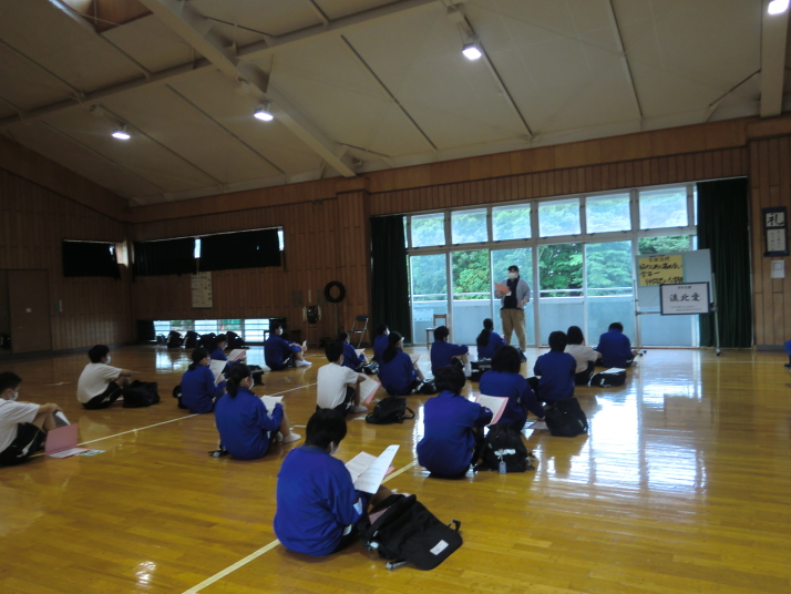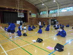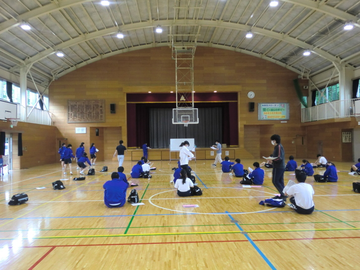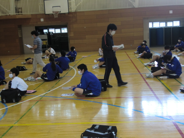8:30より1組は体育館、2組は武道場で各学級分散で登校してきました。