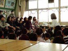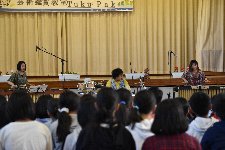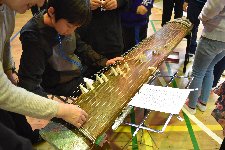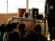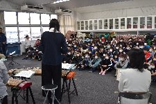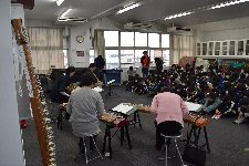 (1月22日) 「きれいな音色だな〜」 「琴ってどういう仕組みなんだろう?」 琴の先生方をお招きして邦楽鑑賞会を行いました。 あまり目にすることのできない尺八や琴を目の前に、子どもたちは興味津々でした。 琴や尺八で様々な曲を演奏していただきました。 |