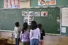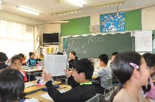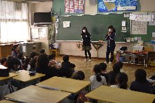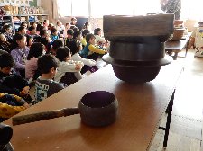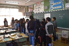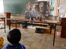 (1月17日〜1月18日) 「やっぱり今と暮らしに違いがあるね!」 「石臼は重そうだな〜」 2日間に分けて社会科の「古い道具と昔のくらし」の学習をしました。 流山市博物館の遠山さんを講師としてお招きし、 道具の使い方や生活の仕方などを教えていただきました。 なかなか見ることのできない道具に、子どもたちは興味津々でした。 |