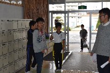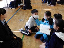 (1月19日) 「高校生との交流は緊張するな!」 「Turn right! Go up! Here!!」 おおたかの森高等学校の生徒と4年生が交流を深めました。 4年生の児童が、校内のお気に入りの場所を英語で案内しました。 相手が高校生ということで少し緊張気味でしたが、交流を深めるにつれて笑顔になり、 英語でやりとりをして楽しみました。 |