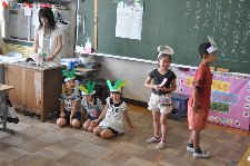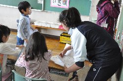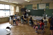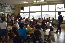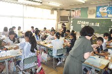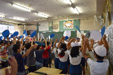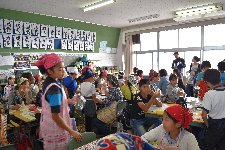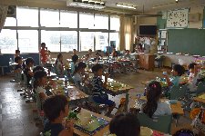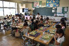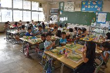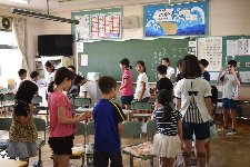 (7月19日) 「カレーおいしい!」 「もう給食終りなの?」 給食最終日もみんなで仲良く給食をたくさん食べました。 2学期からの給食を楽しみしている児童もいました。 最後に作ってくださった給食室の皆さんに感謝の気持ちをこめて「ごちそうさま」を言いました。 |