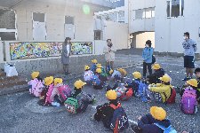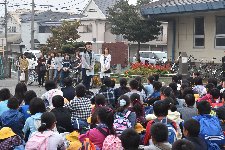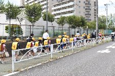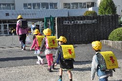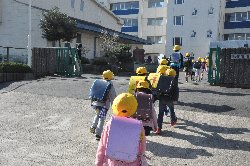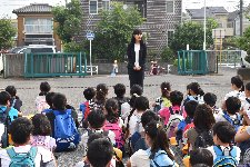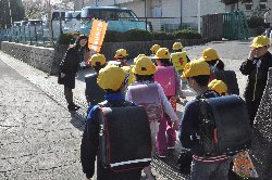 「おはようございます!」「おはようございまーす」 大きな声であいさつをしていました。 1年生はきちんと登校班に並んで登校しています。 |