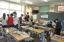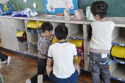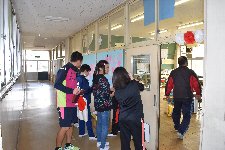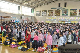 1年生が元気よく登校してきました。 ランドセルから勉強道具を出してあげたり、 ランドセルをロッカーにしまってあげたりするなど 6年生は大忙しでした。 |