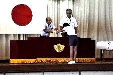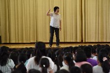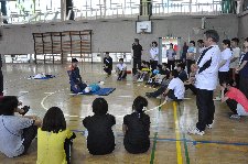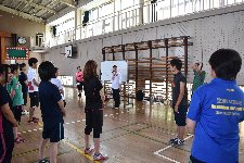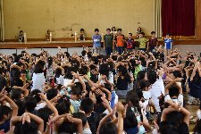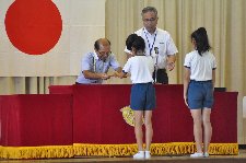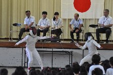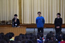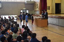 (7月18日) 3年連続で前期大賞を受賞しました! また、競技別でも入賞をすることができ、合わせて表彰を受けました。 今年度は『フェンシング』の選手が運動をすることの面白さやフェンシングの楽しさを 実演を交えてお話をしてくれました。 最後に全校生徒の代表チームが選手と教員の混合チームが『連続馬跳び』で タイムを競い合い、選手と交流を図りました。 |
