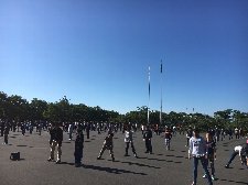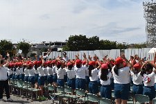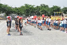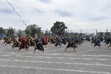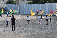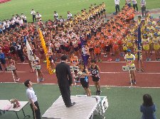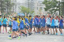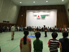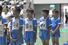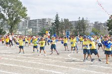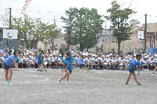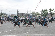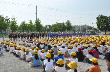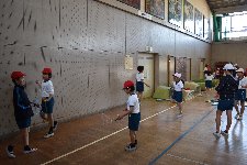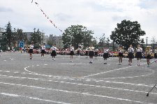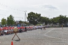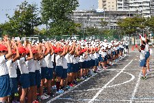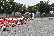 (9月20日) 第2回全体練習では、「入場・退場」、「開・閉会式」を中心に行いました。 1年生は小学校での初めての入場行進でしたが、列をそろえて上手に行進できました。 |