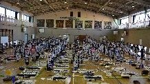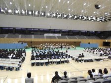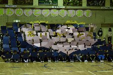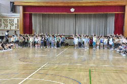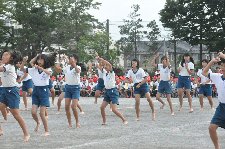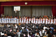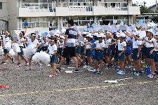(9月26日) 「がんばれ! がんばれ! あか!」 「ファイトだ! ファイトだ! しろ!」 当日、会場となる中学校をお借りして、運動会に向けての予行練習が行われました。 各競技の入退場の仕方、係の動き方などを確認しました。 赤組も白組も一生懸命に応援して、本番ような盛り上がりを見せました。 |