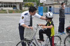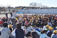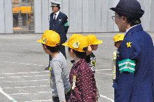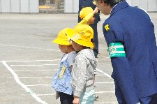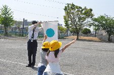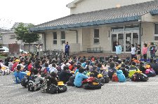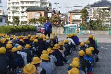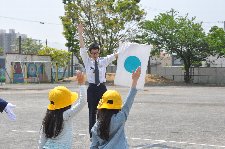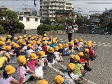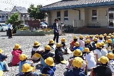 (5月1日) 交通安全教室がありました。 警察の方がいらっしゃってお話をしていただきました。 「青信号で渡ります。」 「道路ははじを歩きます。」 「道路や駐車場では遊びません。」 みんな真剣な顔で取り組んでいました。