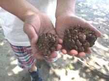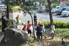 | (11月13日) 「いちょうの葉っぱ見つけたよ!」 「ドングリもあったよ!」 生活科「あきをみつけよう」の一環で町たんけんに行きました。 保護者の方々にご協力いただき、秋をたくさん見つけることができました。 見つけたドングリや松ぼっくりはおもちゃ作りなどに使います。 |