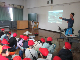 ビデオや実際の消防車などを見て、使用する道具の体験も行いました。