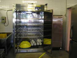 洗浄の終了した食器や食缶などを、約100℃の熱風で乾燥、消毒します。